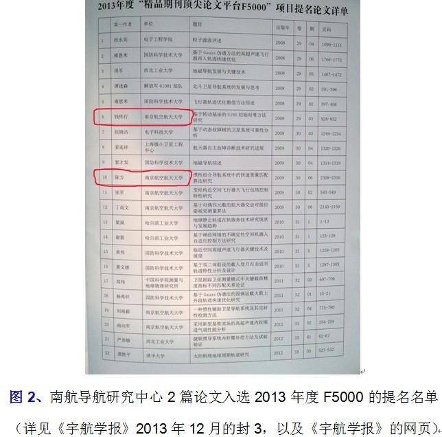 中国科学技术信息研究所2013年未公布了“领跑者5000-中国精品科技期刊顶尖论文”入选论文,刘建业教授及其领导的南航导航研究中心团队共有4篇发表的期刊论文分别入选2012年度F5000论文及2013年度F5000提名论文,详情如下: