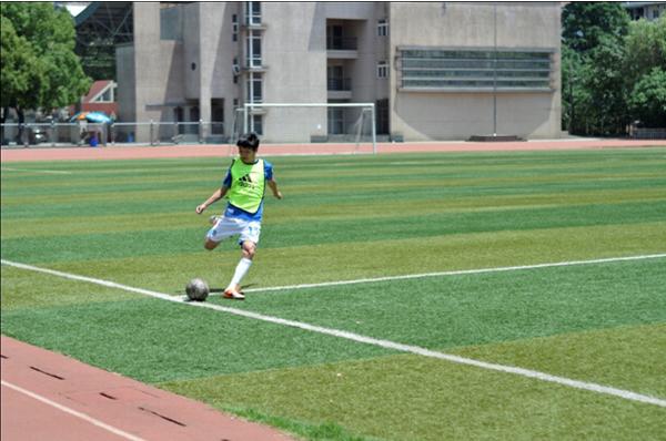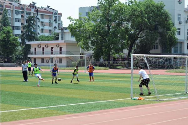 上半场比赛一开始,两支队伍便都表现出超强的实力,炎炎烈日丝毫不减参赛队员的如虹气势,他们配合默契,运球、传球娴熟灵活,突破对方阻拦,打乱对方节奏;假动作以假乱真,出其不意,令人防不胜防;偶尔一记顶球更是精彩绝伦、技艺精湛。两支队伍在如此势均力敌的形式下僵持良久,而后来自研一5&6班代表队的9号队员曹轶柯一个点球,打破僵局,率先得分。研二1&3班代表队也毫不示弱,他们并未被对手的这一精彩点球打乱阵脚,他们依旧稳扎稳打,加强防守的同时伺机进攻。