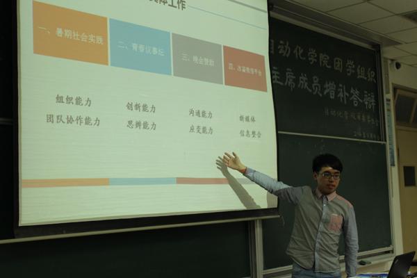 本次答辩分为自我陈述与评委提问两部分。自我陈述部分,答辩者们结合自己的能力特点,根据自己的学生工作经验,对院团学组织现存问题提出了独到见解和解决措施,总结过去的同时展望了未来,有些还配以了精心制作的PPT,足见答辩者们对本次答辩活动的重视。而评委的提问,不仅考验了答辩者们的临场反应能力,也使评委对答辩者的想法有了更深入的了解。