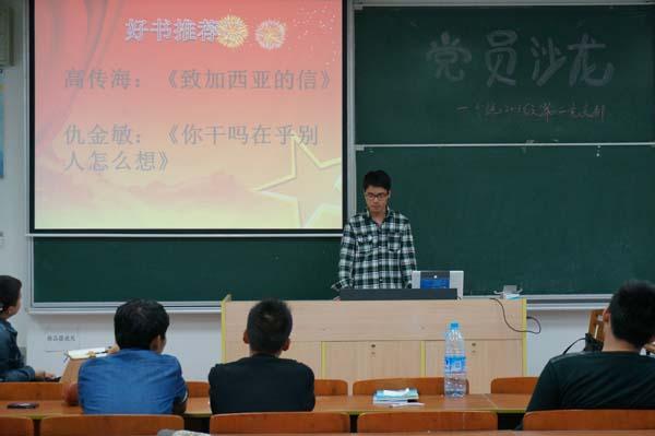沙龙分三个阶段进行。首先,为献礼辛亥革命103周年,在前期观看电影《辛亥革命》的基础上,党员们分别畅谈了自己的观后感。在震撼于革命先辈们伟大人格的同时,也深感革命成果的来之不易和每一个党员自身任务的重大。在好书推荐环节,支部推送了《致加西亚的信》和《你干吗在乎别人怎么想?》两部书,支部倡议每位党员在业余时间通过阅读来扩充自己的知识面,加强个人思想道德修养的提升。在第三阶段,活动围绕香港“占中”事件等热门时事展开讨论,党员们都能够客观、理性的分析和表达自己的认识和见解。