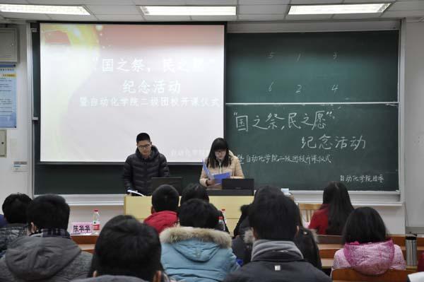 2014年12月11日,taptap点点官方网站在将军路校区6202教室举行了“国之祭,民之愿”纪念活动暨学院二级团校开课仪式。院团委书记季娟、14级辅导员韩楚、徐萍、院学生会主席尤一伟、院团委常务副书记徐宁、国防生代表安旭出席本次活动。学院14级全体班长、团支书参加了活动。此次活动旨在让同学们更加深刻了解南京大屠杀事件的历史意义,肩负起当代大学生应当承担的责任。
