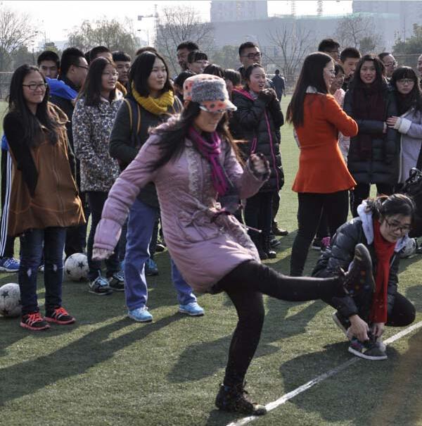 虽然天气寒冷,但操场上活跃的同学们让慧园足球场热闹非凡。在辅导员温暖致辞之后,年级的校园“十佳歌手”带来了动感活力的舞曲,院足球队成员表演了传球、颠球等技术。决赛前的趣味足球单项赛将现场气氛推向了一个小高潮。运球接力、夹抱球接力和女子点球赛充分激发了同学们的热情,加油呐喊声不绝于耳,而游戏中的笑点也是接连不断,令人捧腹。