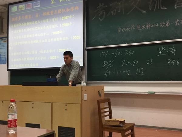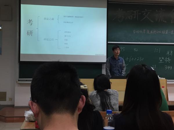 会上,张绍杰老师首先对历年考研情况做了总结接着介绍了自控系相关导师情况,强调了考研重在坚持。包胜学长和周俊学长对考研从准备工作到具体复习计划以及应试技巧几个方面对大家进行了全面的介绍。其中周俊学长的风趣讲解,让大家听得津津有味,同时他从自己身边的一些失败例子给我们也敲响了警钟。另外于鸿达,鲁之君学长着重给大家又讲了复习以及调剂方面的相关事情。最后考入上交的蔡慧敏学姐为大家分享了考取外校的成功经验,包括资料如何获得、专业课有何差别等方面的问题。给了大家不一样的选择和思路。最后的提问环节,大家积极踊跃参与,现场气氛活跃。
