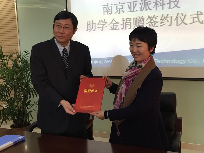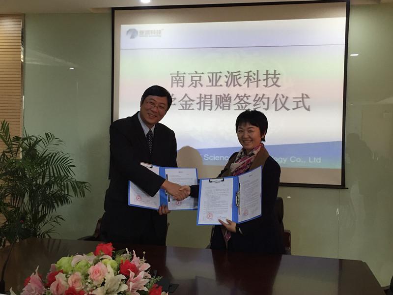 南京亚派科技股份有限公司总经理葛文海、taptap点点党委副书记沈伯秀代表双方签订协议。南京亚派科技股份有限公司将出资20万元分5年资助taptap点点官方网站电气相关专业学习成绩优异、且家庭经济困难的本科生和硕士研究生。