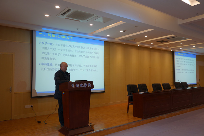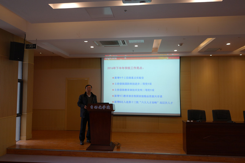 接着,院长姜斌同志代表学院做工作报告,报告从党建、教学、科研、师资、学科建设、人才培养、学生工作和工会工作等八个方面全面对学院2016年下半年的进行全面总结,对2017年的工作进行全面部署。2016年下半年,学院多方面取得了新的突破和发展,突出亮点有新增1个工信部重点实验室,主持获批国防科技进步二等奖1项、教育部技术发明二等奖1项,新增1门教育部首批国家级精品资源共享课,新增6名入选第十三批“六大人才高峰”高层次人才等。姜院长要求全体教师在2017年要以“十三五”规划和“双一流”建设为契机,乘势而上,科学发展,全面推进学院各项工作再上新台阶,为创建研究型学院而努力!