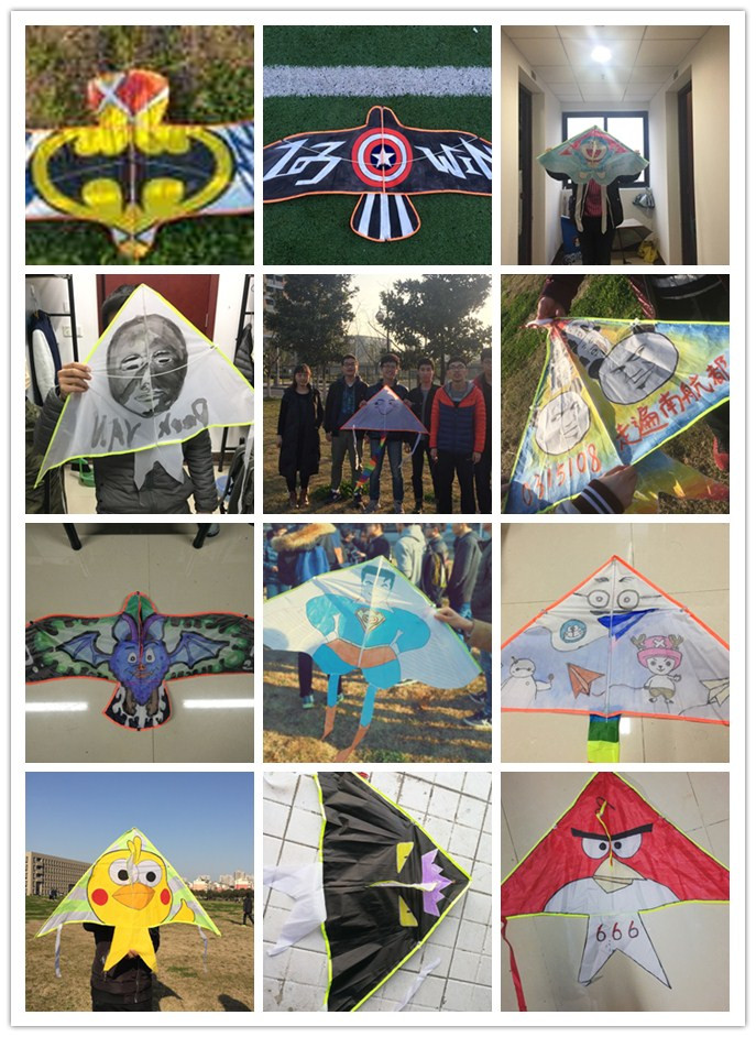 下午四点,同学们带着各自精心设计和绘制的风筝来到活动场地,试飞、交流,跃跃欲试,对于这个儿时的游戏活动,很多同学显得十分兴奋。此次风筝节,15级中心组统一购置了空白风筝,提前分发给每个班级进行DIY绘制。比赛当天,各班拿出的风筝可谓“争奇斗艳”、“脑洞大开”。有展翅的雄鹰、燕子,也有萌萌的卡通人物如愤怒的小鸟、哆啦A梦,还有酷炫的蝙蝠侠、美国队长、超人,还有各种贱萌的表情包、班级LOGO等等。虽是工科学生,但是DIY风筝展示出了大家的强大的艺术细胞。