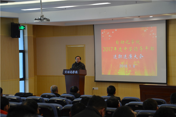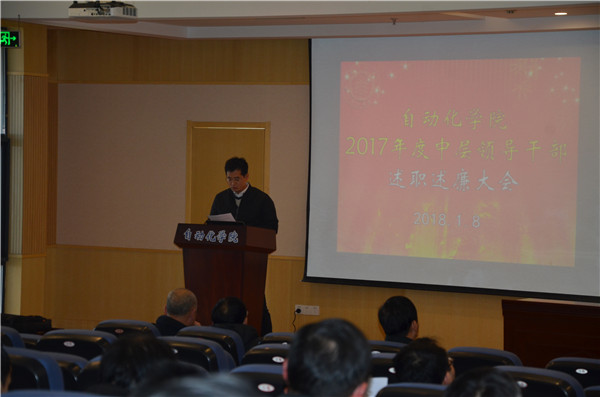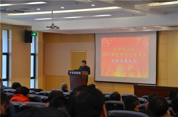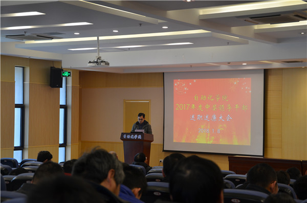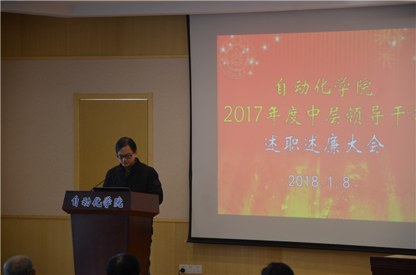 然后,院长姜斌代表学院做2017年行政工作总结。他从人才引培、教学科研、学科建设、立德树人等方面进行了业绩总结梳理,学院各方面发展势头良好。姜院长从政治学习、业务开展、廉政建设等方面进行了个人工作总结,分析不足,提出改进措施