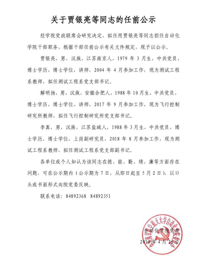 关于贾银亮等同志的任前公示
