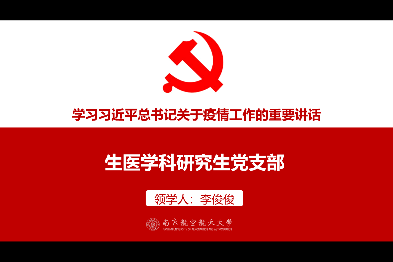 本次党课在新型冠状病毒肺炎疫情的特殊背景下开展,课上学习习近平总书记关于疫情工作的重要讲话,并连线战“疫”一线工作人员就抗击疫情工作与大家做交流分享。此次党课由支部书记李俊俊主讲,生医学科研究生党支部全体成员、发展对象和入党积极分子线上参与了本次党课。