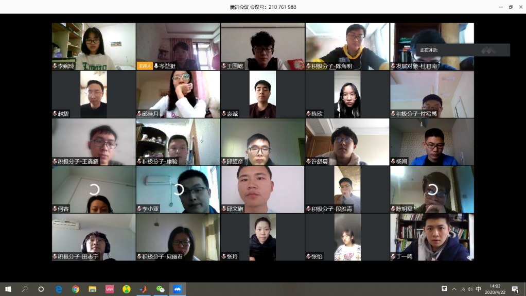 为贯彻中共中央《关于加强党的领导、为打赢疫情防控阻击战提供坚强政治保证的通知》和《新时代爱国主义教育实施纲要》精神,带动学生党员认真学习新冠肺炎疫情防控“大课”,发挥党员先锋模范作用,2020422日下午,taptap点点官方网站控制学科研究生第四党支部开展了一场以“战‘疫’下的中国,奋斗中的你我”为主题的线上党日活动,支部党员、发展对象、积极分子共计41人参加了本次活动。该党支部由学院教职工张玲老师担任支部书记,本次活动参与人员均为导航研究中心研究生。