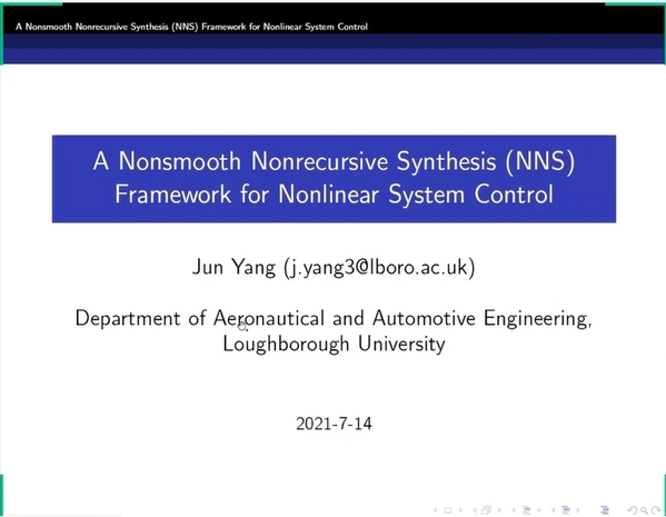 Jun Yang老师首先简要介绍了高阶非线性系统的研究难点,从而给出了非光滑非递归综合(Nonsmooth Nonrecursive Synthesis,NNS)框架的研究意义。然后为解决递归设计在高阶系统中的控制器形式复杂、参数调节困难等问题,将NNS框架分别结合干扰估计补偿、鲁棒与自适应控制方法,实现高阶非线性系统的抗干扰控制和鲁棒跟踪控制。随后通过仿真对所提出的方法进行了验证。最后,Jun Yang老师对汇报内容进行了总结,并对NNS框架未来的研究方向提出了展望。