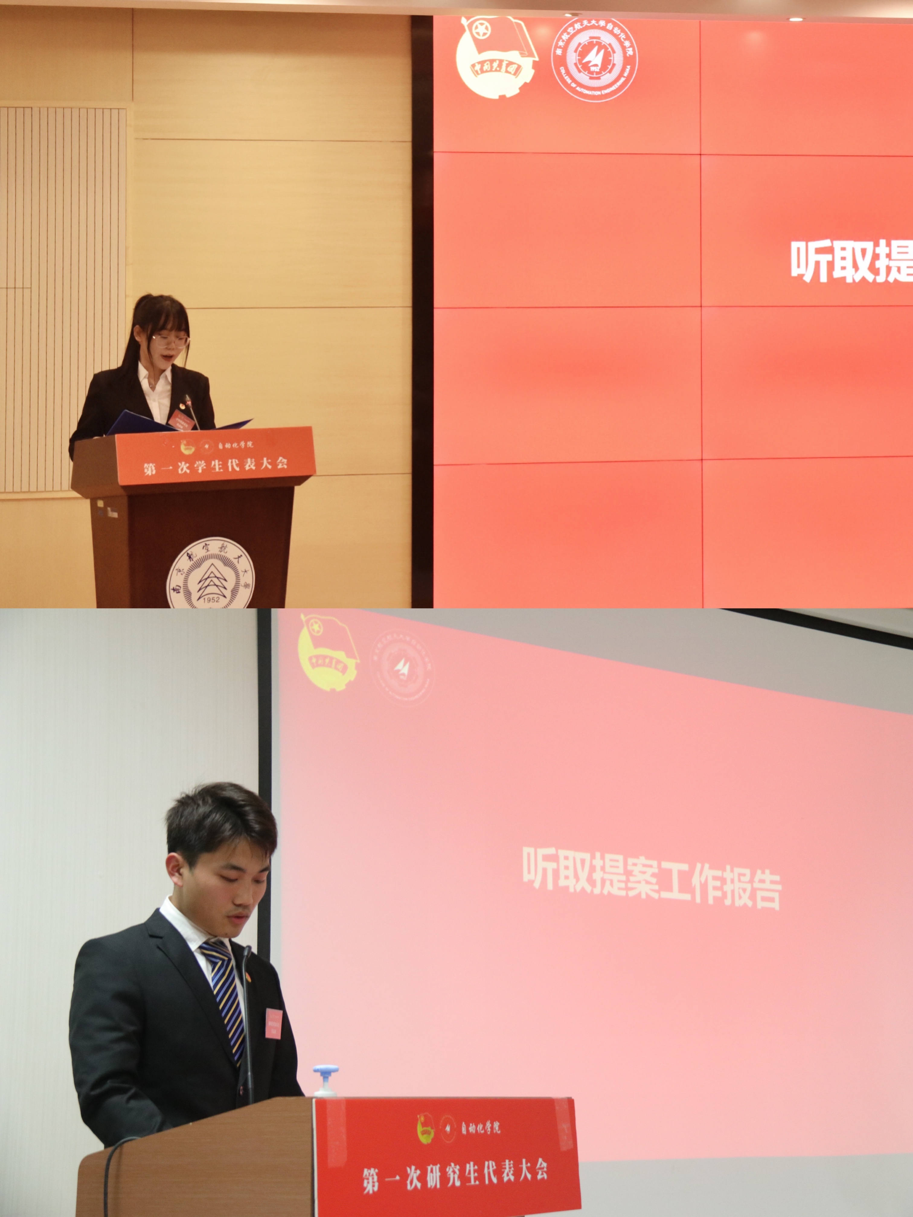 裴国蓉、罗统分别代表本次学生会、研究生会筹备委员会作提案工作报告。本次学代会、研代会收到了代表提案39件,涉及公共服务、教学管理等五个方面,较为全面真实的反映了taptap点点同学的意见建议。提案工作的认真推进也是学生会、研会全心全意服务同学,担当师生联系桥梁的良好体现,对学院和学校的发展建设具有重要意义。