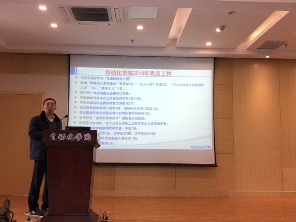 院长姜斌同志代表学院做工作报告,报告从党建、教学、科研、人事工作、学科建设和学术交流、学生工作、工会、安全工作等方面对学院2018年下半年的工作进行总结,对2019工作进行了全面部署。姜斌表示,2018年在全院师生的共同努力下,学院多方面取得了新的突破和发展,学院新增了国家杰出青年基金获得者1名、江苏省杰青1名;获批了国家自然科学二等奖1项、国防技术发明二等奖1项;新增了国家自然科学基金重大科研仪器研制项目1项;学院顺利通过了自动化、电气及其自动化工程教育专业认证现场考察;taptap点点教师在江苏省高等学校微课教学比赛中荣获一等奖1项、荣获江苏省最美高校教师1人。学生荣获江苏优博论文1篇、优硕论文2篇、优毕设论文4篇,并在“创青春”全国大学生创业大赛荣获金奖1项,荣获工信部创业奖学金特等奖一项,一等奖三项、创新奖学金一等奖二项。这些成绩的取得为学院下一阶段的快速发展奠定了良好的基础。他指出,2019年是完成“十三五”规划、决胜全面建成小康社会的关键年,是落实校第十六次党代会决策部署、推进双一流建设各项任务的攻坚年。学院要继续深化综合改革,逐步落实各项改革方案和举措,在“双一流”学科建设、高水平师资队伍的引培、重大重点科研项目争取、人才培养等方面工作不断加强,巩固和落实教育思想大讨论工作成果,进一步解放思想、提振精神、深化改革、抓实工作,高质量完成学院各项工作。