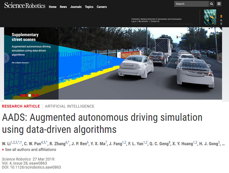 taptap点点龚华军教授指导的博士生李伟同学,以第一作者和共同通讯作者身份发表的学术论文“AADS: Augmented Autonomous Driving Simulation Using Data-Driven Algorithms”,于2019年3月27日刊登在《科学》杂志子刊《科学·机器人学》(Science·Robotics),该刊编辑在杂志主页对论文进行了推荐。该研究成果介绍了一种增强现实的自动驾驶仿真系统,它可自动创建逼真的道路场景,为自动驾驶车辆提供更为可靠且廉价的实验室模拟方法,可大规模用于训练和测试评估自动驾驶系统的路径规划和决策算法。《科学·机器人学》旨在传播机器人与人工智能相关领域的代表性研究成果,平均每期刊出不多于4篇的研究类文章。
