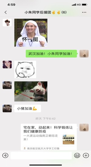 “两周啦,武汉挺住!小朱同学加油!”taptap点点官方网站的朱同学每天都能收到同学们的关心话语,她的班长和室友单独为她成立了后援团,每天发送一些疫情相关的正能量的文章,在群内给她加油打气。她的同学说:我们希望她在武汉能安安心心、不孤独,武汉封城了,但我们都在!