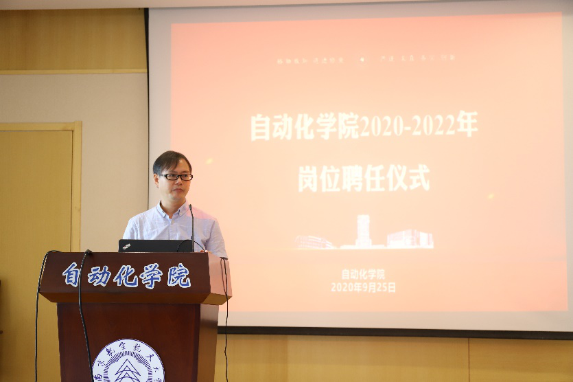 聘任仪式开始,院长江驹首先对各位教师表示祝贺,并介绍了此次岗位评聘情况及后续工作。此次岗位评聘,学院进行了深入的调研论证,广泛听取了教师们的意见,并经过教代会讨论通过,最终制定出具有学院特色的岗位聘任方案。从目标导向、任务设岗、优岗优级、动态调整四个原则进行评聘,充分调动学院教师的优势与力量。希望此次聘任高岗位的老师能发挥核心带头作用,希望青年教师积极拼搏,奋发向上,为学院的快速发展做出更大的贡献。