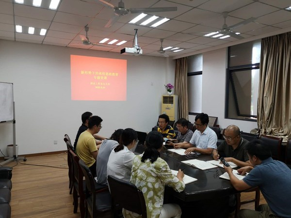 贾书记结合具体教学案例,讲解了如何合理的将爱国主义、工匠精神、创新精神、担当精神、社会主义核心价值观等思政元素融入专业课程教学中。同志们交流了在专业课程中实施思政教育的方法。