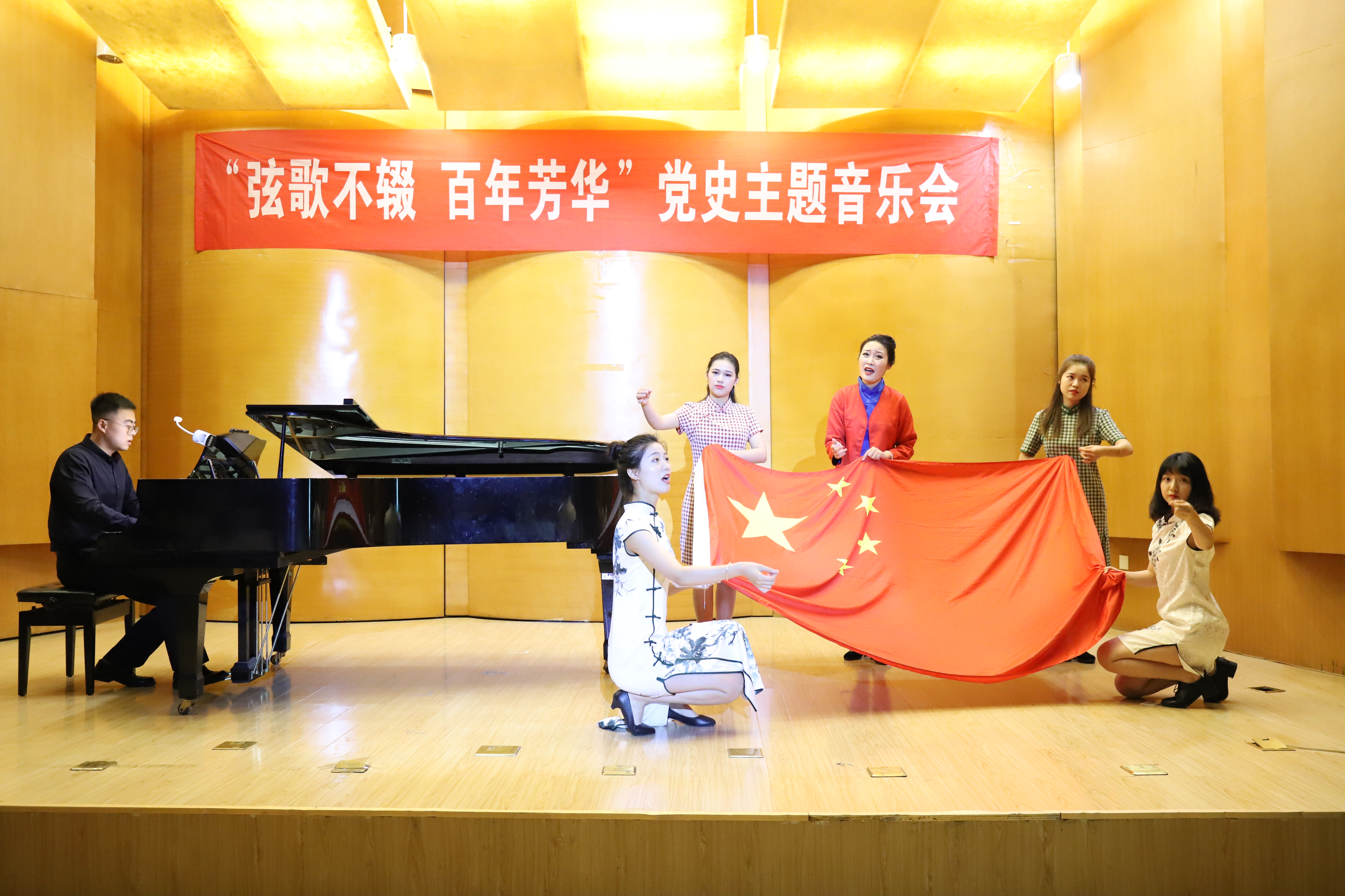 最后,在由姜斌、板俊荣、田睿、鹰之歌合唱团、艺术学院学子等带来的《没有共产党就没有新中国》合唱中,全体演员和观众自发挥舞国旗旗激情高歌,音乐会在热烈的气氛和浓郁的爱国爱党情怀中圆满结束。