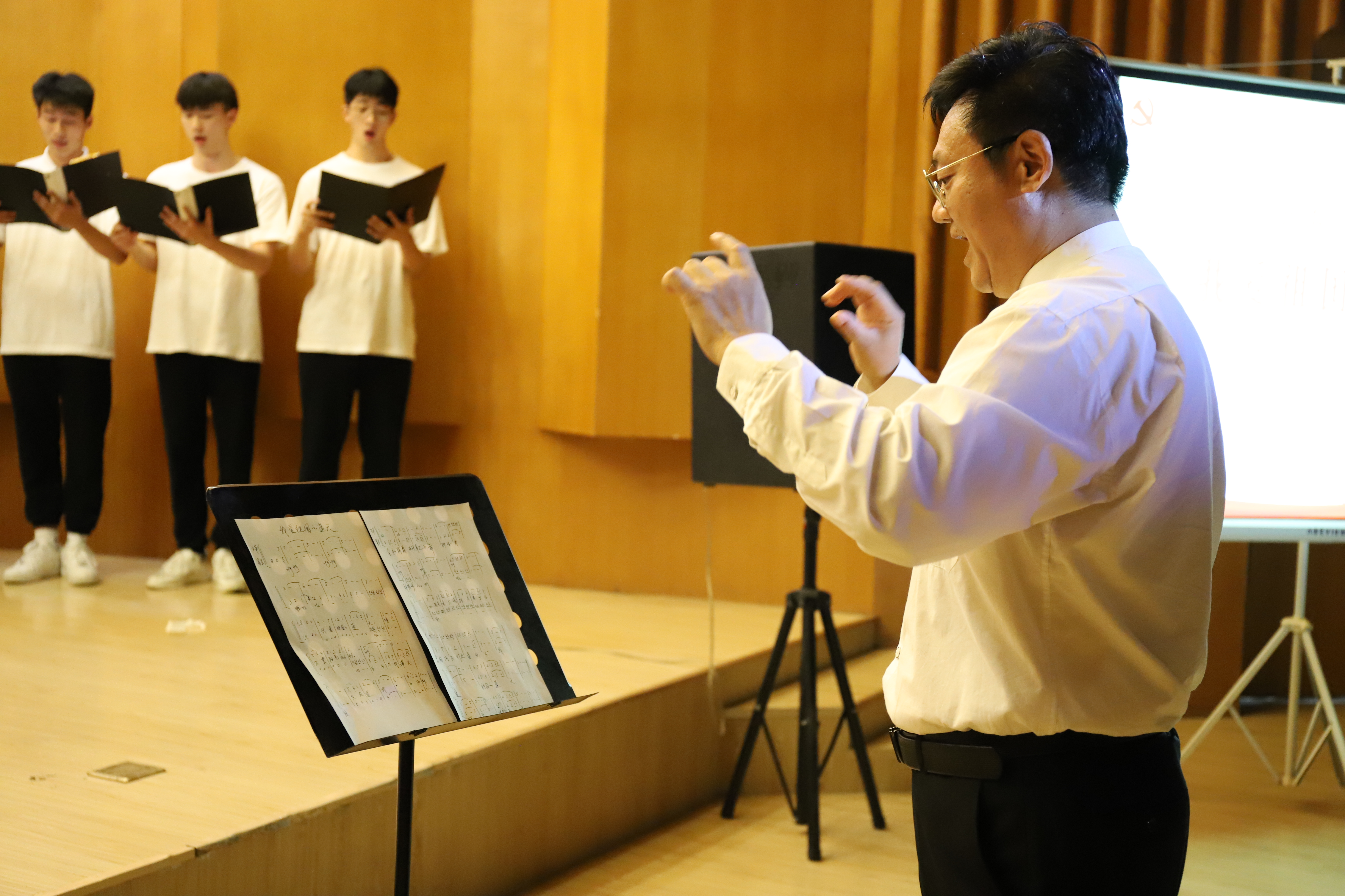 由板俊荣教授指挥、鹰之歌合唱团带来《南湖的船党的摇篮》在一曲曲歌声里开始讲述中国共产党在新民主主义革命时期的救国、在社会主义革命和建设时期完成的兴国、在改革开放时期坚持实事求是、解放思想的富国、在中国特色社会主义新时代攻坚克难、励精图治取得诸多成就的强国故事。