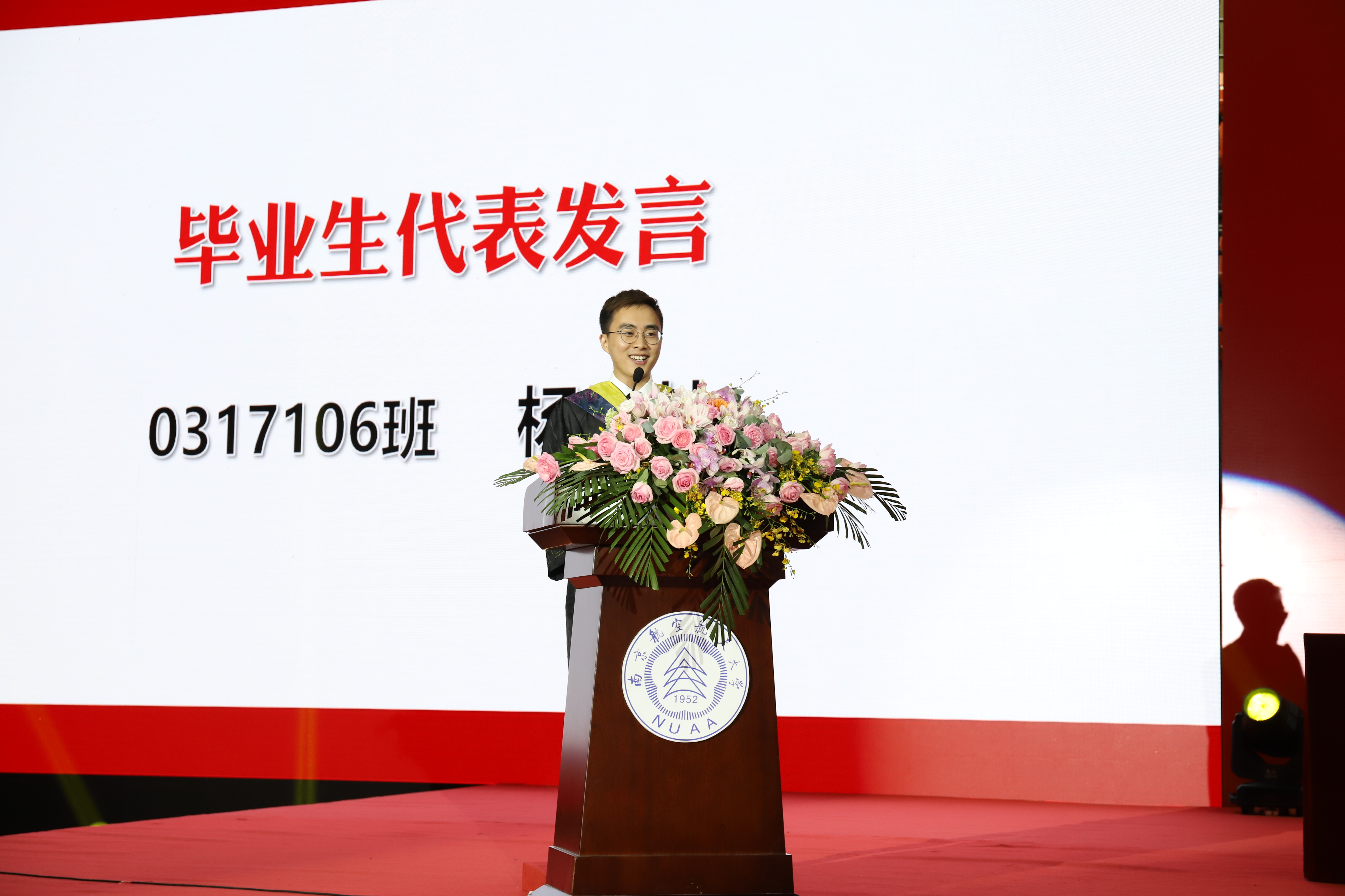 典礼在充满回忆和惜别之情的毕业纪念视频中拉开序幕。典礼上,两位毕业生代表为毕业生们向母院送上一份饱含深情的礼物——一册以2017级同学们为主角的毕业画册,学院党委李文雷书记代表学院接受了这份来自毕业生的特殊赠礼,同时他也代表学院为毕业生代表赠送印有学院特色的纪念品——一面印有院徽、院训的院旗和一套印有学院标识的书签、钥匙扣、徽章。这些纪念品代表着学院希望大家牢记南航自动化人的使命,脚踏实地,不断超越自我。