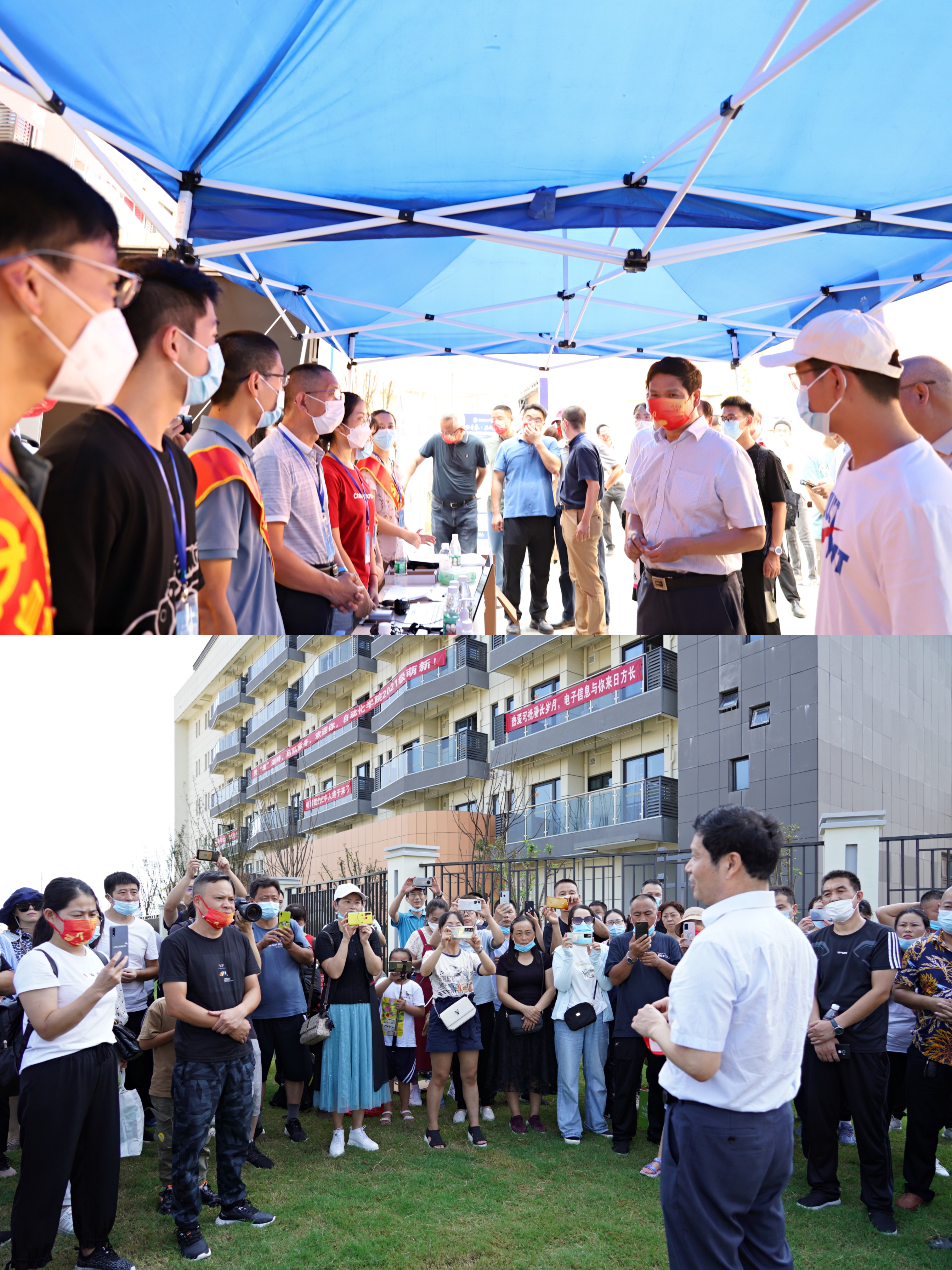 为做好科学防疫、平安开学,新生报到时谢绝家长及亲友陪同入校。面对校门口久久不愿离去的家长们,李文雷、江驹等院领导多次到校外,与家长们亲切交流,表示学校一定会安排好同学们的学习生活,请家长们放心。