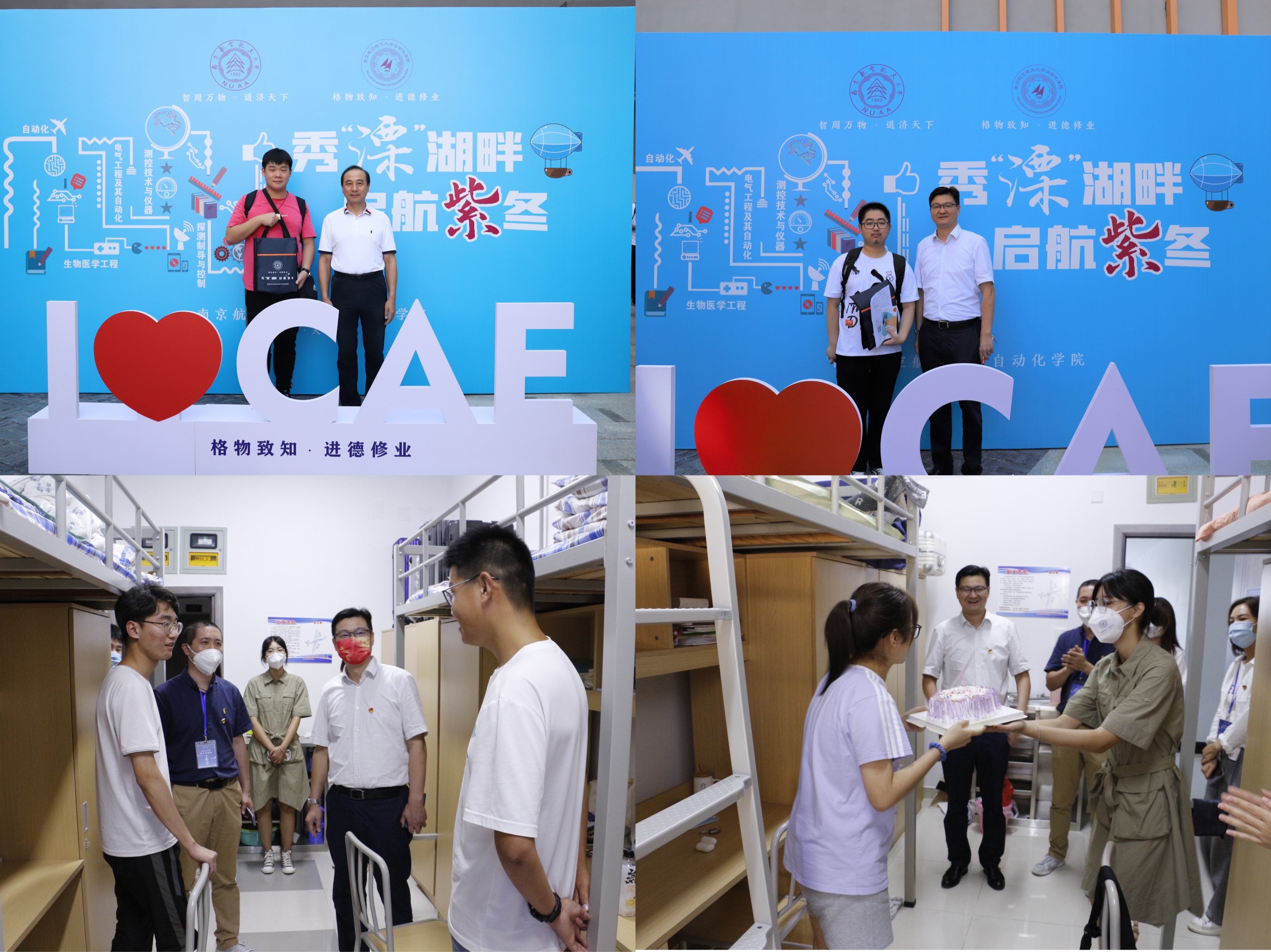 李文雷、江驹、王晓琳、丁琛在报到现场向新生赠送“新生大礼包”;走进学生宿舍,亲切慰问学生。为在报到日当天过生日的新生准备了生日蛋糕和庆生活动,鼓励新生们热爱学习,热爱生活,积极向上,奋发有为,做新时代的严谨、务实、求真、创新的新自动化人。