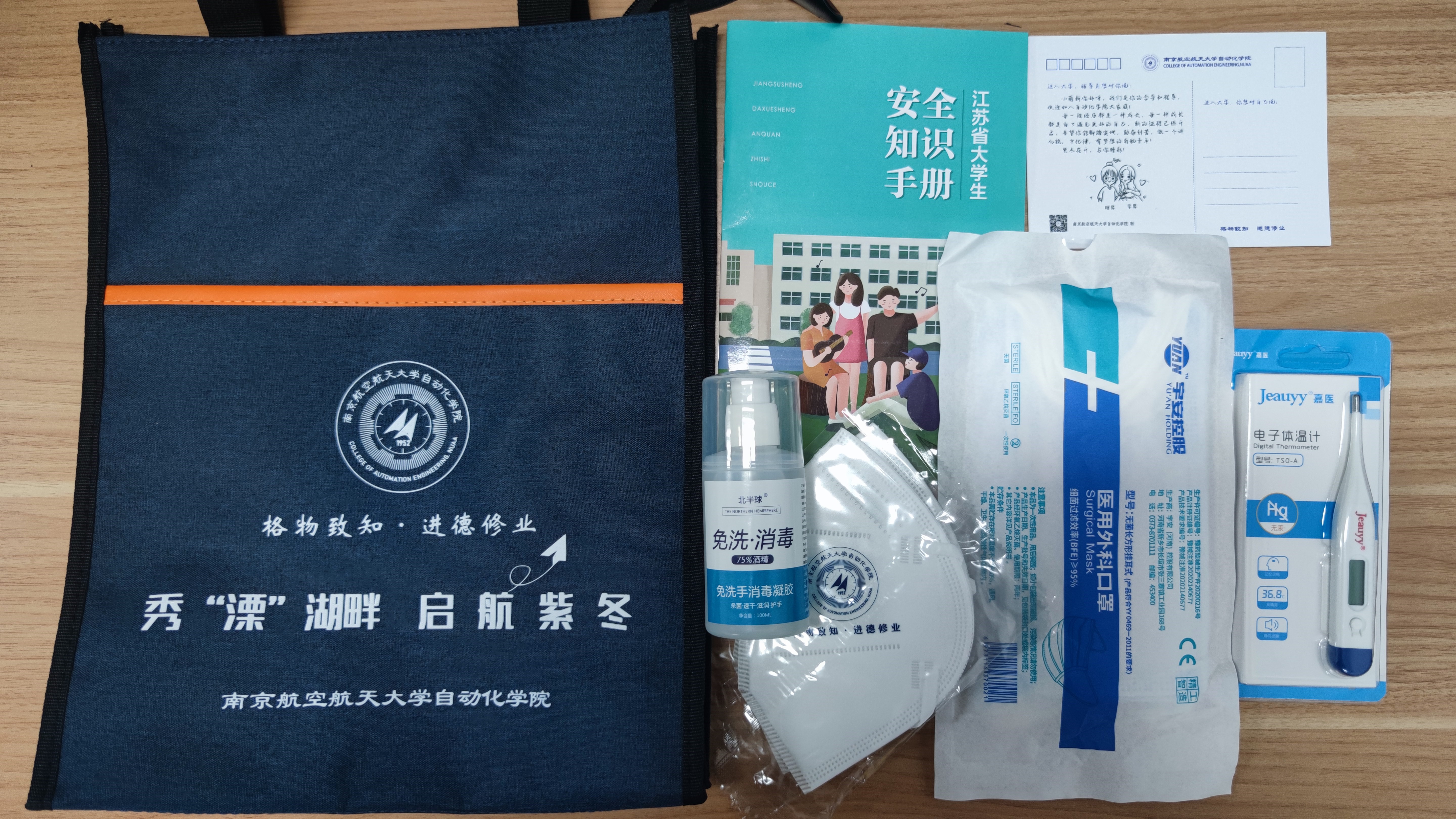 今年在报到现场还为每位新生派发了“新生大礼包”,定制的学院文件包里装有体温计、口罩、洗手液等防疫物资,在疫情的特殊时期,为新生送去温暖,希望每一位学生都能做好防护,重视安全。