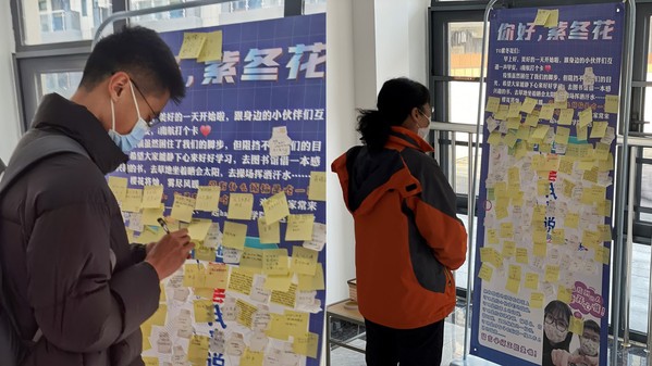 为避免人员聚集,留言板活动采取了“自助留言、自取糖果”的形式。活动现场提供纸笔等文具供同学们撰写所思所想,附近另设糖果筐供同学自取自用。不少同学在此驻足留言,分享糖果。