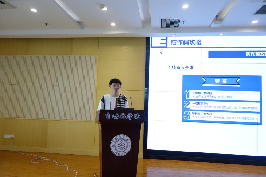 本次大会还邀请了2022级春季博士研究生班安全员蒋安昊开展反诈骗宣讲,总结了常见网络骗局,通过各类案例提醒同学们保护好个人财产安全,切实提高防诈骗意识,保持清醒。