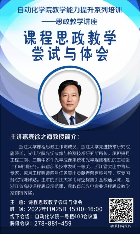 2022年11月25日下午,taptap点点邀请到浙江大学徐之海教授作题为《“课程思政”教学尝试与体会》的线上专题讲座。本次讲座由taptap点点官方网站副院长魏佳丹主持,学院党委书记李文雷、院长陈谋、各系所中心教学副主任、近三年入职青年教师和教学办全体老师出席活动。讲座采取线上、线下相结合的方式,全校50余名专任教师听取了报告。