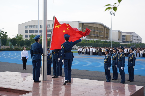 7点整,升国旗仪式正式开始。天目湖校区国旗护卫队迈着整齐划一、铿锵有力的步伐,护送着五星红旗正步走向旗杆。伴随着激昂的《义勇军进行曲》,23级全体师生注视着五星红旗冉冉升起,在熠熠晨光中迎风飘扬。