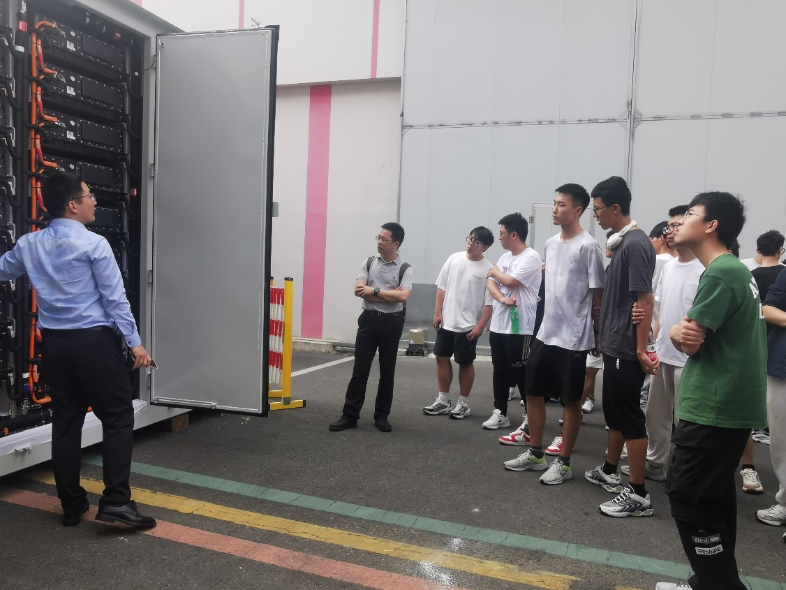 师生一行跟随苏文电能储能产品经理谷康伟实地参观苏文电能电力运维核心区域配电运维大厅、电力设备生产流水线、新能源板块储能箱以及公司零碳园区,近距离了解如何通过先进的智能监控系统和数据分析技术实现对电网运行的实时监控和精准管理与电力设备精密高效的生产全过程。学生们在参观过程中深入了解苏文电能的智能制造战略和数字化转型计划,对电力行业的未来发展充满了期待。