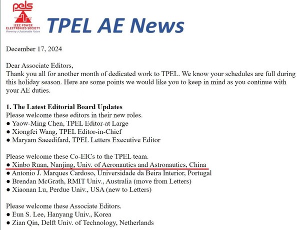 近日,电力电子领域国际顶级期刊IEEE Transactions on Power Electronics(TPEL)正式公布了新任命的Editor-in-Chief (EIC)、Co-EIC与Associate Editor名单。taptap点点电气工程系阮新波教授被任命为Co-EIC,任期自2025年1月开始,为期3年。 阮新波教授曾长期担任IEEE TPEL的Associate Editor。